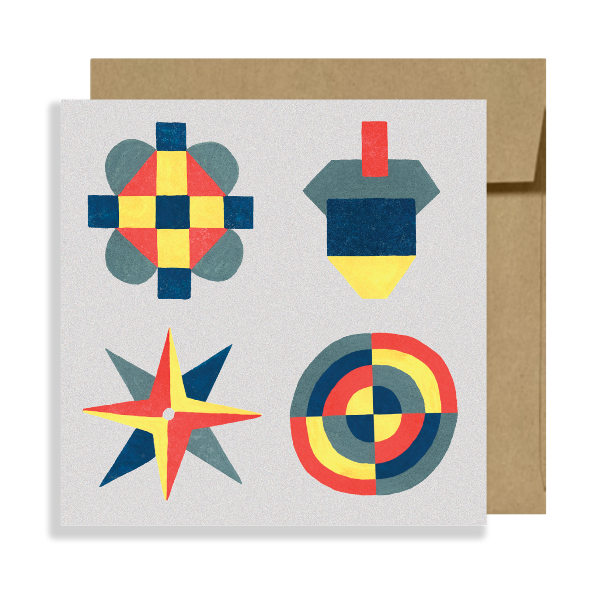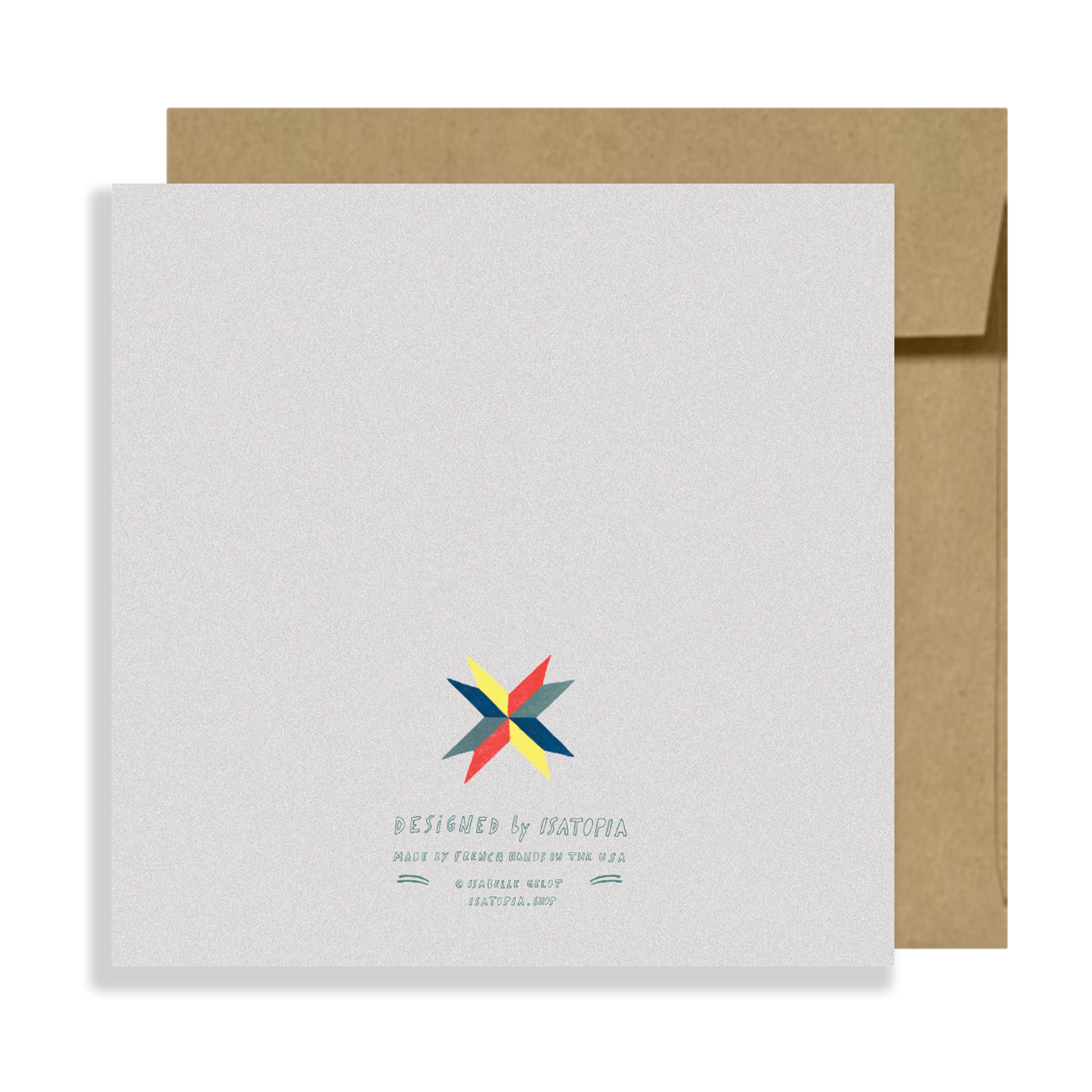 The Acorn card is made out of gouache illustrations inspired by old quilted patterns and vintage toys, perfect to send colors for any occasion! 5"x5” folded card, double-sided, printed in the USA on sustainably produced 80lb card stock. Each folded card is blank inside, comes with a kraft recycled square envelope and is wrapped in a biodegradable cello bag. Made by French hands in the USA!