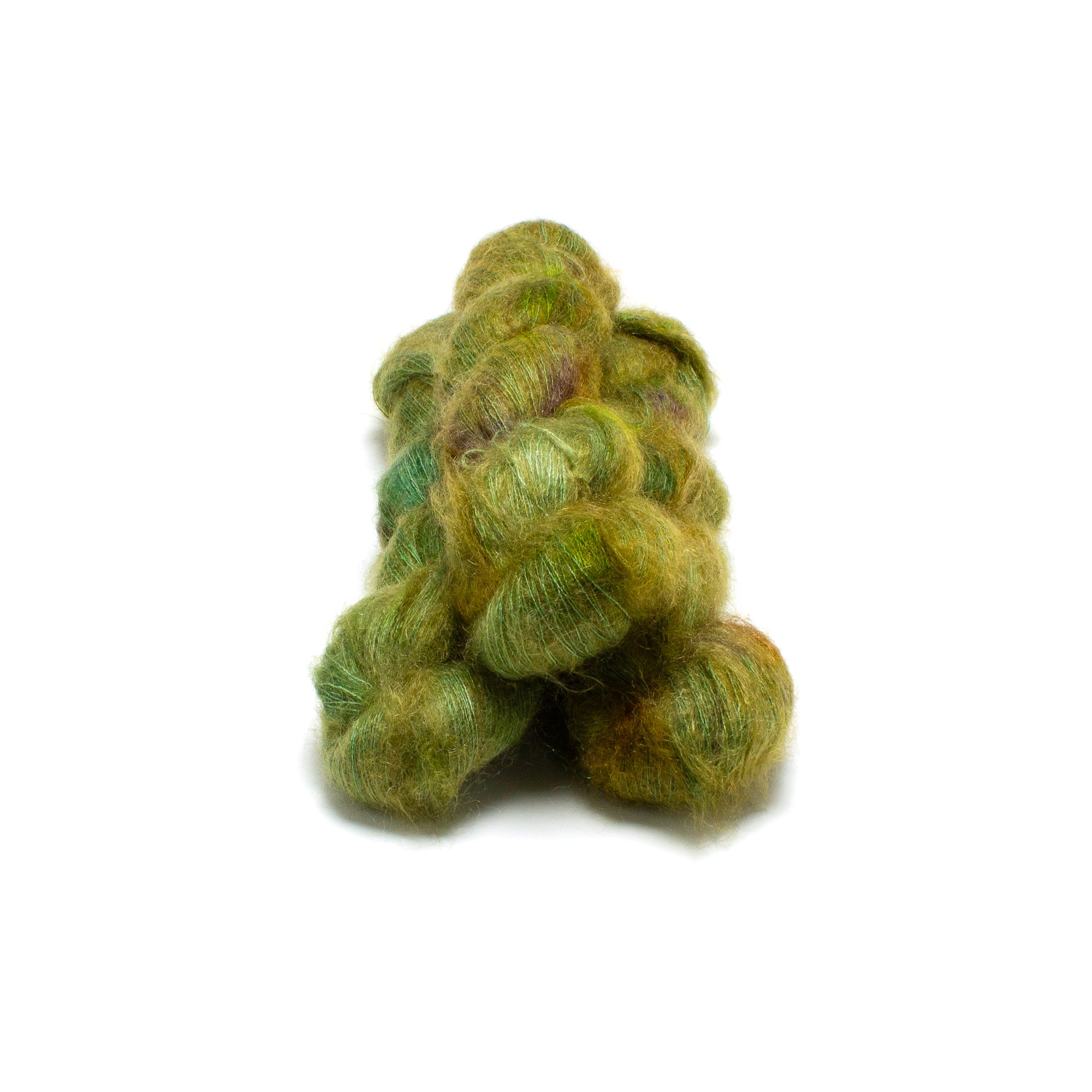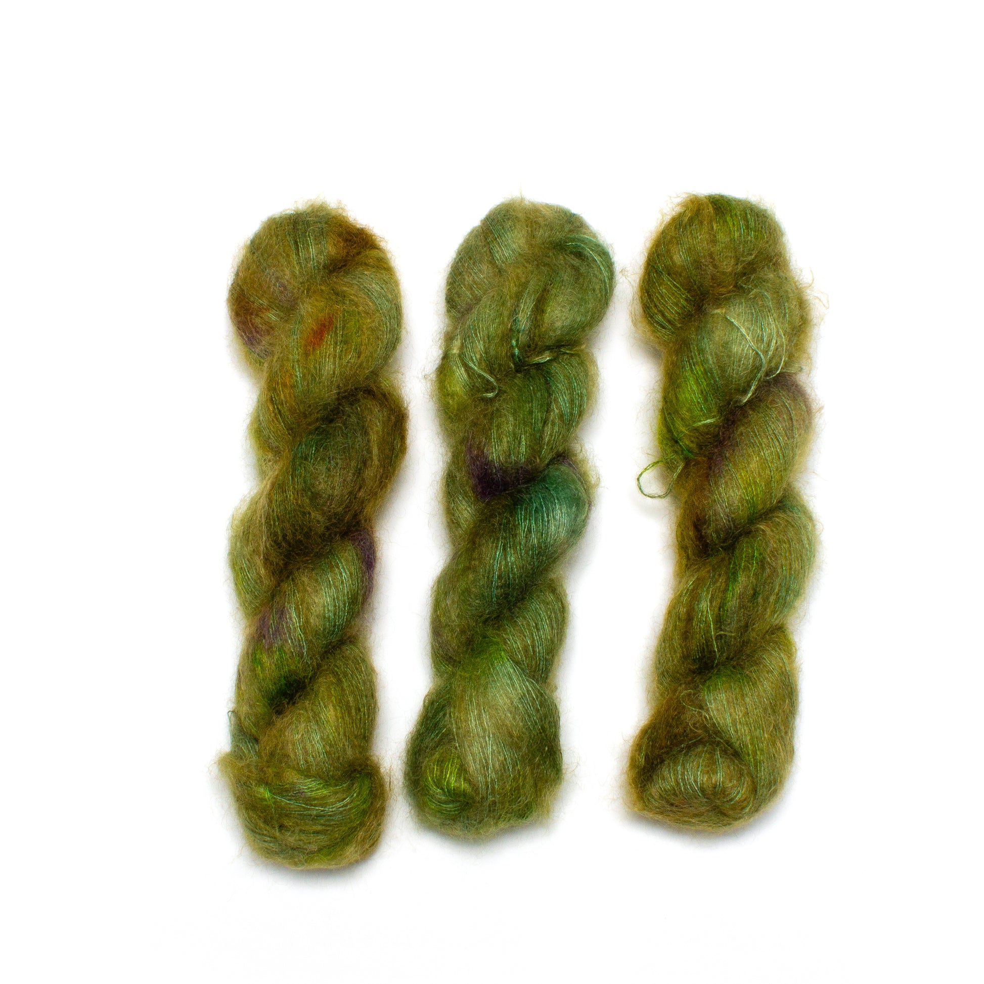 The combination of mohair and silk creates a shiny, airy, strong fiber. The dye takes to both very well and we are always fascinated by the way it takes to the Ritual Dyes palette. The silk core sometimes glows amid the wispy mohair. Fae can be used alone or paired with any other fiber to create something luxurious.